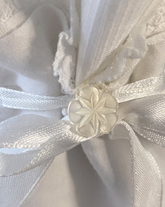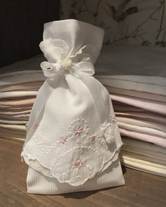 Ce sachet de lavande est idéal pour des intérieurs et des armoires qui sentent bon la Provence ! Il est réalisé à partir d'une dentelle et d'un tissu ancien brodé auxquels j'ai ajouté un doux éclat avec un fil de soie rose. Un bouton vintage permet de fermer la pochette avec un ruban. En plus de parfumer le linge agréablement, les sachets de lavande repoussent naturellement les mites, à utiliser donc sans modération dans nos placards.